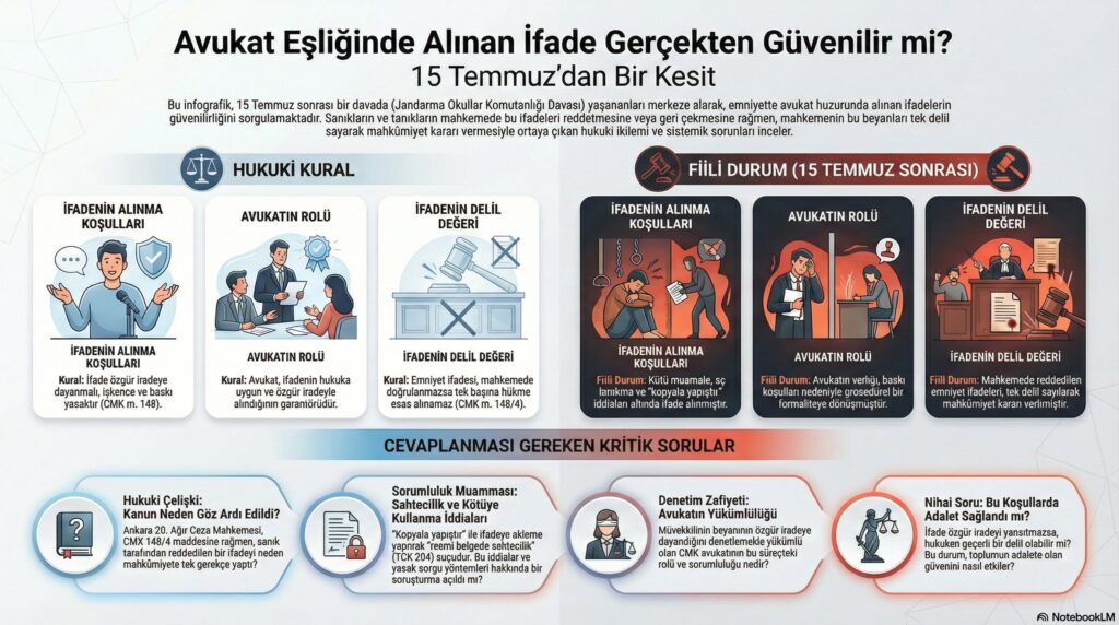 15 Temmuz sonrasında yürütülen soruşturmalarda, emniyette alınan ifadelerin niteliği ve bu ifadelerin yargılama süreçlerinde nasıl kullanıldığı önemli tartışma alanlarından biri hâline geldi. Emniyette günlerce süren kötü muamele, işkence edilerek ve günlerce aç bırakılarak alınan ifadeler, gözaltındaki askerlerin hem fiziksel hem de zihinsel dirençlerini zayıflattı. Emniyette alınan bu ifadelerin müdafi huzurunda alınmasına rağmen, bazı bölümlerin kişilerin kendi beyanı olmadığı hâlde “kopyala–yapıştır” yöntemiyle eklendiği veya önceden hazırlanmış bir kurgunun parçası olabileceği yönünde ciddi şüpheler bulunuyor.