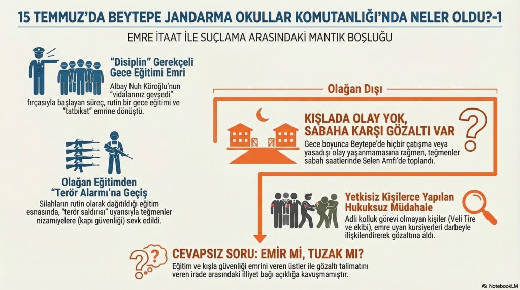 15 Temmuz günü Beytepe Jandarma Okullar Komutanlığı’nda verilen emirler ve yapılan hazırlıklar incelendiğinde, gerek içtima öncesi yapılan bildirimlerin gerekse gece eğitimi kapsamında aktarılan talimatların askerî mevzuat, disiplin kuralları ve hiyerarşik yapı içerisinde olağan uygulamalar çerçevesinde şekillendiği görülmektedir. Kursiyer teğmenlere yönelik olarak yapılan konuşmaların, artan terör olayları ve güvenlik riskleri karşısında farkındalık oluşturmayı, kriz anlarında nasıl hareket edilmesi gerektiğini hatırlatmayı ve askerî disiplinin pekiştirilmesini amaçladığı anlaşılmaktadır. Mahkeme beyanlarına da yansıdığı üzere, gece eğitimi ve tatbikat vurgusu, Okullar Komutanlığı’nda daha önce de sıklıkla başvurulan bir eğitim yöntemi olup, bu kapsamda verilen emirlerin herhangi bir kanuna aykırılık içermediği, aksine mevcut güvenlik konjonktürü içinde askerî eğitim ve tedbir anlayışıyla örtüştüğü ortaya çıkmaktadır. Bu yönüyle, 15 Temmuz günü gündüzden geceye uzanan süreçte kursiyer teğmenlere iletilen talimatların, olağan dışı bir amaçtan ziyade askerî düzen, disiplin ve güvenlik farkındalığı çerçevesinde değerlendirilmesi gerektiği anlaşılmaktadır.