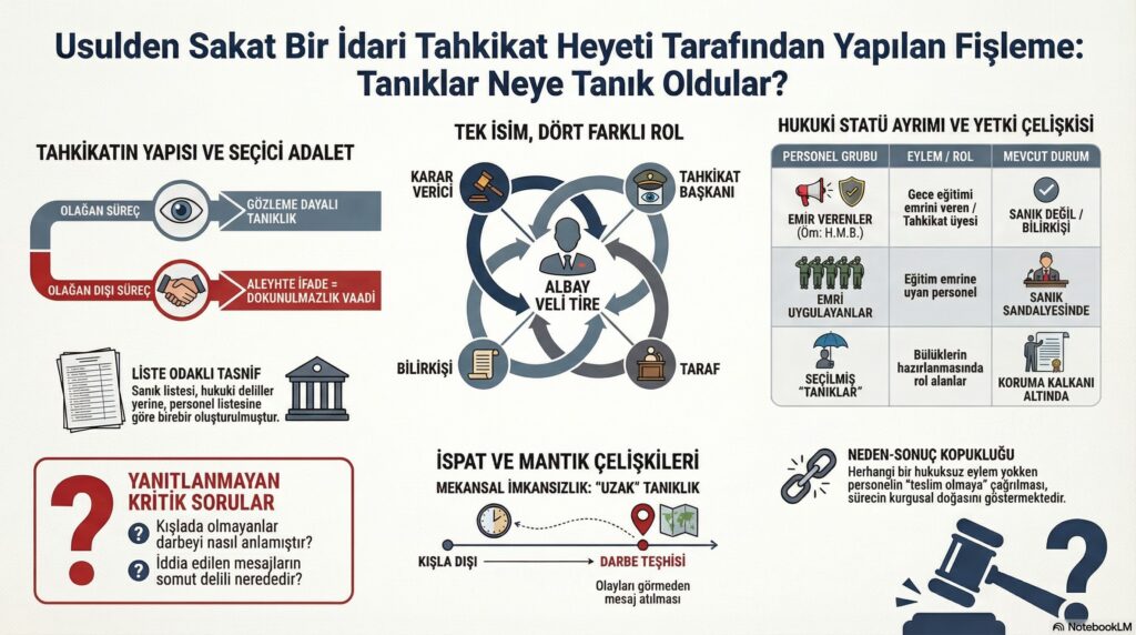 İdari tahkikatın yürütülüş biçimi, kumpasın izlerini daha da belirginleştirmektedir. Aynı isimlerin olayın her aşamasında farklı rollerle ortaya çıkması, yargılamanın adil bir zeminde ilerlemediğini göstermektedir: